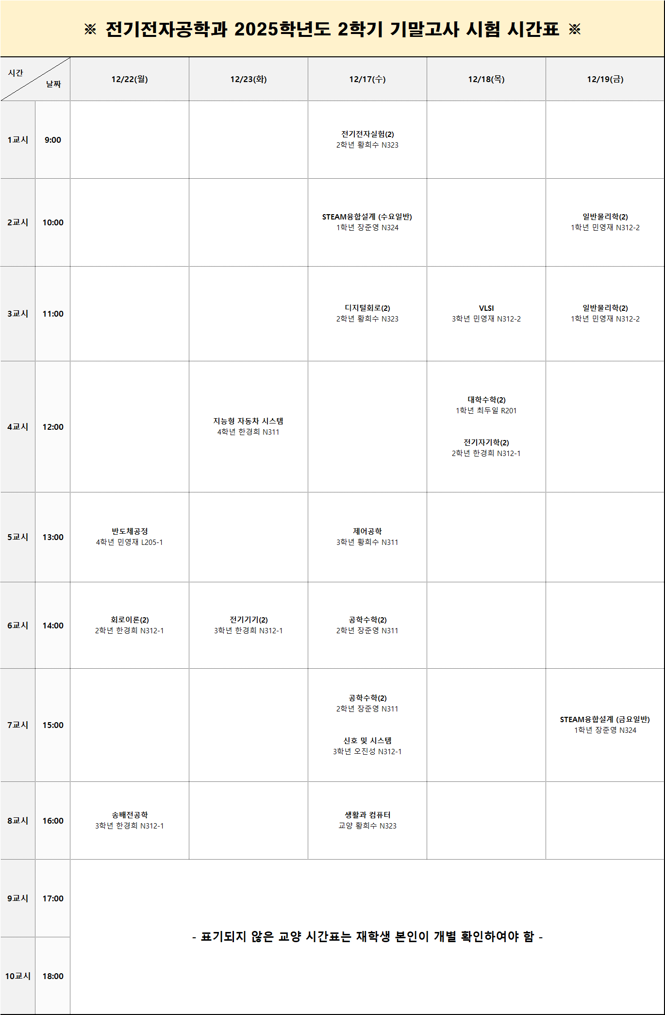 본 시간표는 2025학년도 2학기 전기전자공학과의 "전공" 과목의 시험 시간표이며 교양 수업 중 사전에 시간표를 전달받은 수업들만 일부 시간표 안에 포함되어 있습니다.