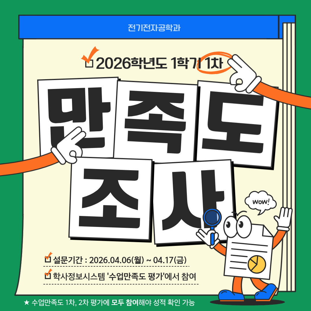 2026학년도 1학기 수업 만족도 조사(1차)가 4월6일(월)부터 4월17일(금)까지 진행됩니다. 1차와 2차 평가에 모두 참여해야 성적 열람이 가능하오니, 기간 내 반드시 참여해주시기 바랍니다.